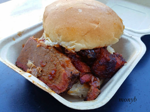 Meat on a Mission is a truck I haven’t visited before. I decided to stop by for a brisket sandwich. I love brisket! I prefer my brisket sliced (and they give you a choice). The slices were a decent size and the portion was good for the price. It was fragrant with smoke and the sauce was flavorful. The brisket was slightly underdone and not as tender as I would expect. The bun was sweet and easy to grab…for a little while. By the time I got to the last 1/4 of my sandwich, the bottom of the bun was a soggy, gooey mess. The presentation was messy, including the box that was covered with sauce on the outside.