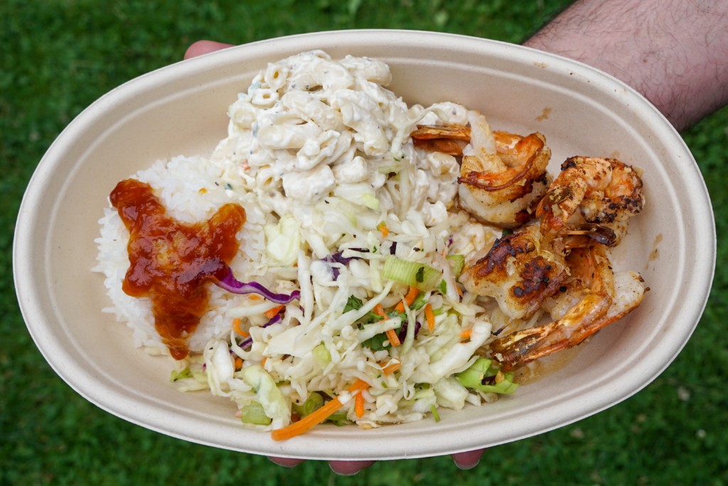 I live on the North end so I haven’t made it to the Buddha Braddah storefront but I have been to the truck before. I got a half order of garlic shrimp because a full portion would have been too much for this type of event. The shrimp had a nice, smoky flavor and was great quality. The rice was perfectly cooked and the mac salad had a nice peppery flavor. The slaw rounded it all out.