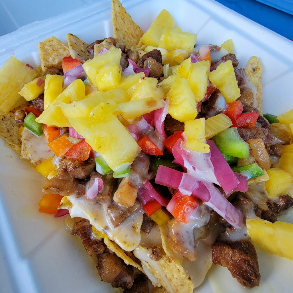 My second favorite is the Aloha Pork Belly Nachos which has the same dreamy cheese sauce, pork belly, and pickled red onions with the addition of fresh pineapple, green bell peppers and sweet bell peppers.
