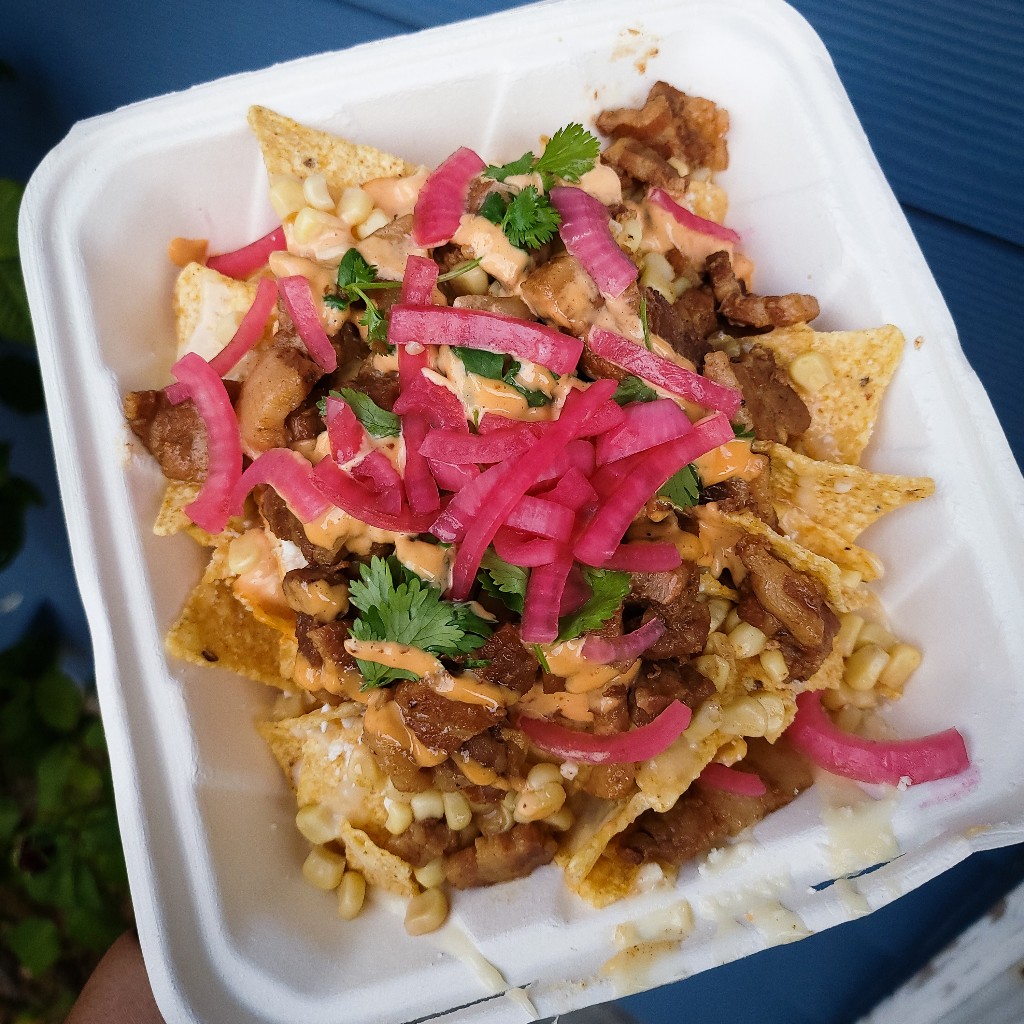 Street Corn Nachos with pork belly was the first dish I ever ordered from Nacho Mama’s. It will also be the last at the end of October. The pork belly is marinated and tender. The fontina cheese sauce, roasted corn, chipotle mayo, pickled red onions, cotija cheese and cilantro come together to form my absolute favorite dish from the truck!