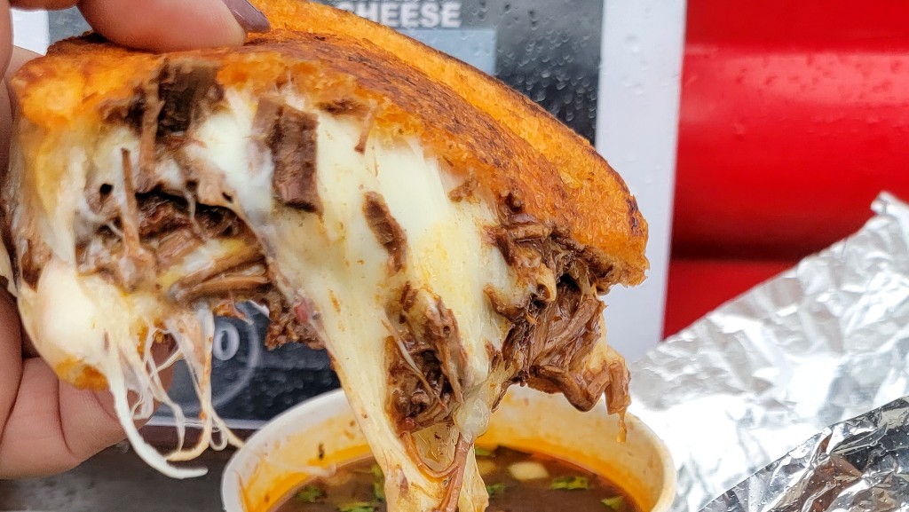 Beef Birria Grilled Cheese is one of the more recent specials and one of my favorites. It’s oaxacan cheese on sourdough, served with consommé on the side. The beef dip with the dreamy cheese pull is enough to lure any grilled cheese lover to the truck.