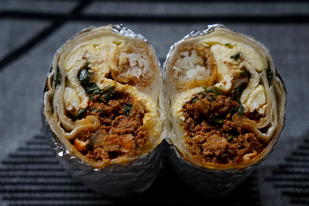 Chorizo Breakfast Burrito is a fan favorite, Sunday-only special. It’s one of my favorite dishes filled with cheese, crispy tots, scrambled eggs, housemade pork chorizo, onion, cilantro, and salsa of your choice. I’ve stocked up on these before and put them in my freezer so I can enjoy them whenever the craving hits.